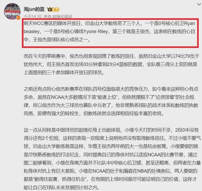 果不其然,今年亚洲杯场均13分4.2板并入选最佳阵容的表现,对王俊杰的NCAA生涯是有着加成作用,如今的他在旧金山大学不仅首发位置牢固,还成为了核心球员,出场时间和球权都迎来了暴涨。